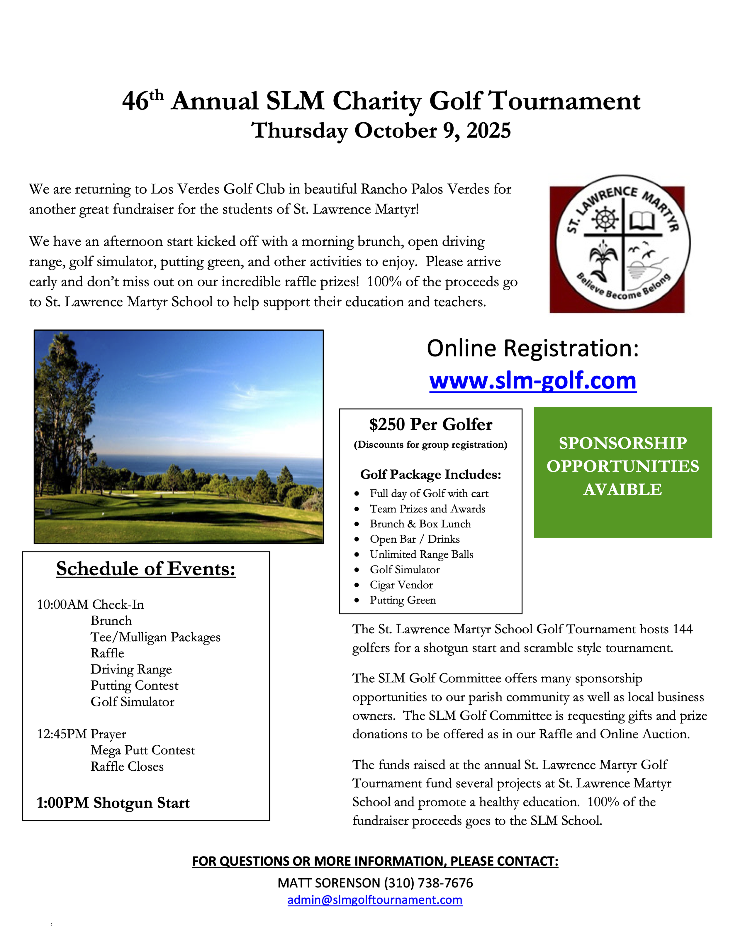 or mail a check directly to St. Lawrence Martyr School, 1950 Prospect Ave., Redondo Beach, CA 90277